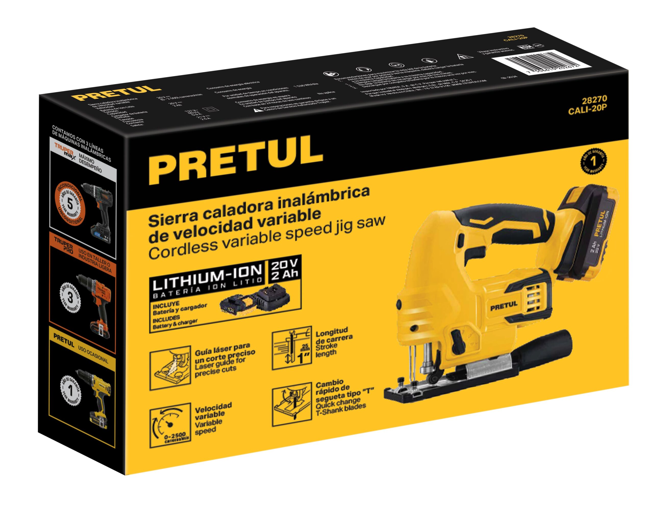 Sierra caladora, 20V, 1 batería 2Ah, PRETUL